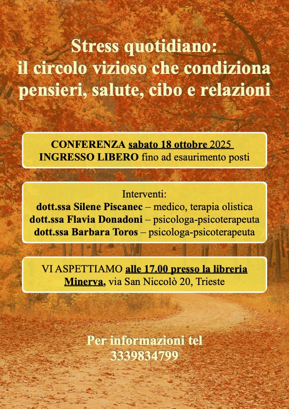 CONFERENZA sabato 18 ottobre 2025, INGRESSO LIBERO fino ad esaurimento posti. Interventi: dott.ssa Silene Piscanec, medico, terapia olistica; dott.ssa Flavia Donadoni, psicologa-psicoterapeuta; dott.s...