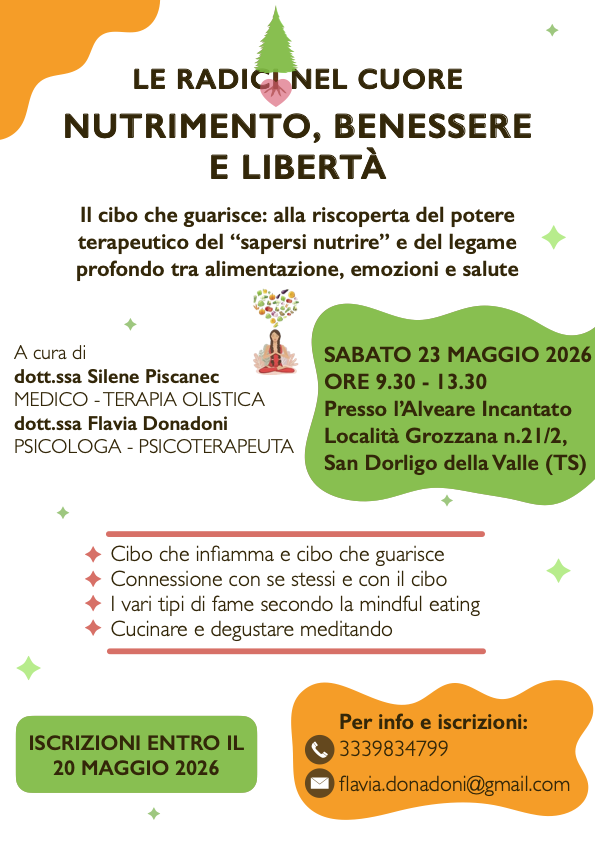 Il cibo che guarisce: alla riscoperta del potere terapeutico del "sapersi nutrire" e del legame profondo tra alimentazione, emozioni e salute. Questo corso, in cui anche si cucinerą e si degusterą insieme meditando, si terrą SABATO 23 MAGGIO 2026 alle ORE 9.30 - 13.30, Presso lAlveare Incantato, Localitą Grozzana n.21/2, San Dorligo della Valle Trieste (TS). A cura di dott.ssa Silene Piscanec MEDICO - TERAPIA OLISTICA e dott.ssa Flavia Donadoni PSICOLOGA -PSICOTERAPEUTA. ISCRIZIONI ENTRO IL 20 MAGGIO 2026.